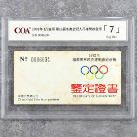 1991年1/3盎司第16届冬奥会双人花样滑冰金币证书