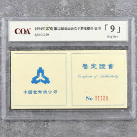 1994年27克第12届亚运会女子游泳银币证书