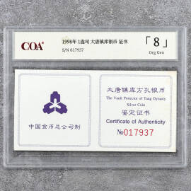 1998年1盎司大唐镇库银币证书