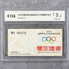 1991年5盎司第25届奥运会女子短跑银币证书
