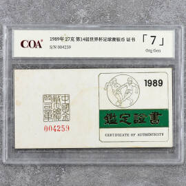 1989年27克第14届世界杯足球赛银币证书