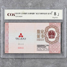 2015年1/10盎司长春电影厂成立70周年金币证书