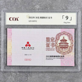 2022年30克熊猫铂币证书
