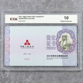2021年100克吉祥文化美意延年银币证书