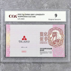 2022年5克吉祥文化福寿康宁彩金币证书