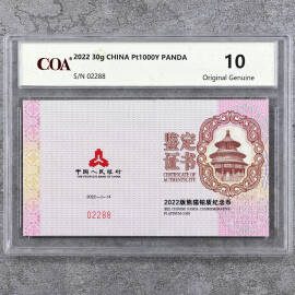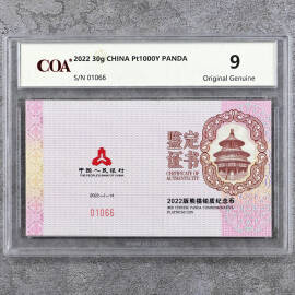 2022年30克熊猫铂币证书