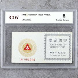 1992年12盎司熊猫银币证书