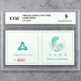 1998年12盎司生肖虎银币证书