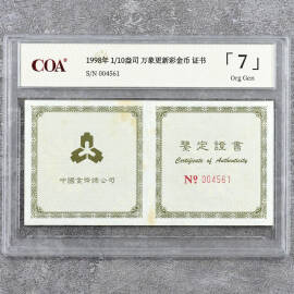 1998年1/10盎司万象更新彩金币证书