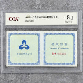 1997年1盎司吉庆有余彩银币证书
